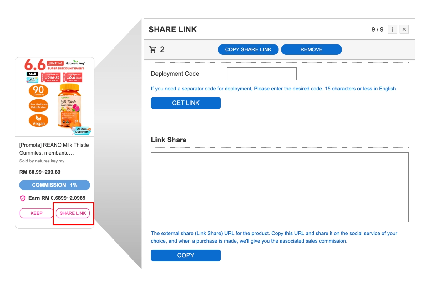 You can check the registered products in the Comm. LINK BOX, you can check the registered products. If you want to re-copy (issue) the code for each product, select the desired product and select the 'COPY SHARE LINK' menu at the top.
