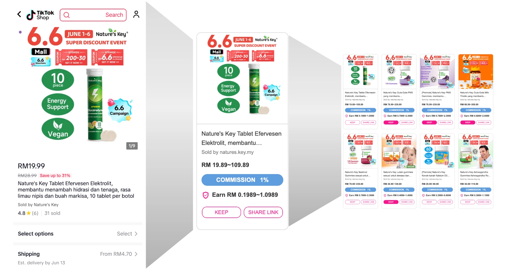 Comm. Provides a list of products that you can earn commissions for promoting to external channels via Link Share. Each product is sold through TikTok Seller, and the commission and terms for each product are negotiated separately.